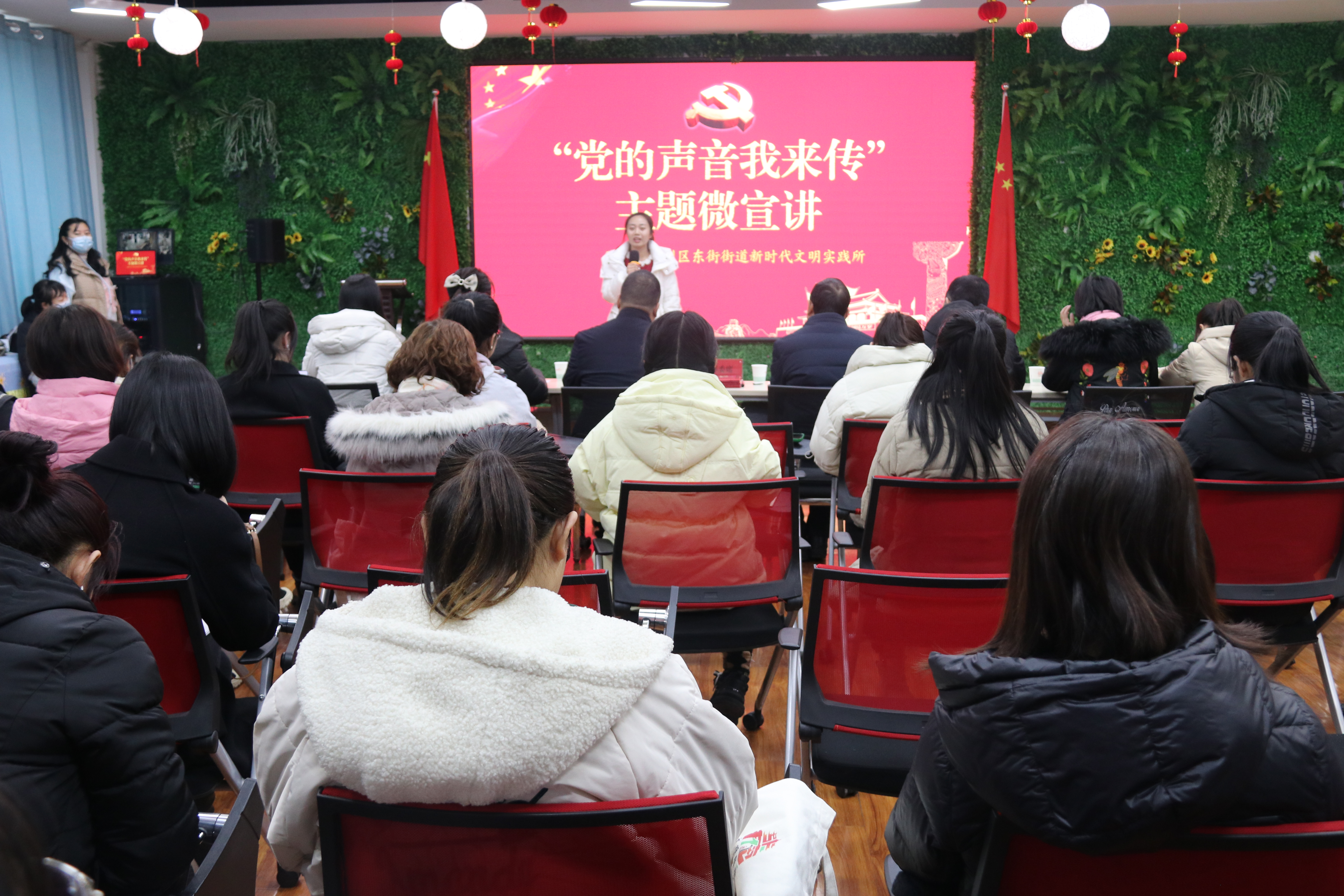 甘州融媒讯 近日,甘州区东街街道新时代文明实践所举办“党的声音我来传”主题微宣讲活动。10名青年志愿者登台宣讲,感悟党的二十大精神、抒发爱国情怀,展现青春风采。各社区50余名党员居民代表现场聆听。